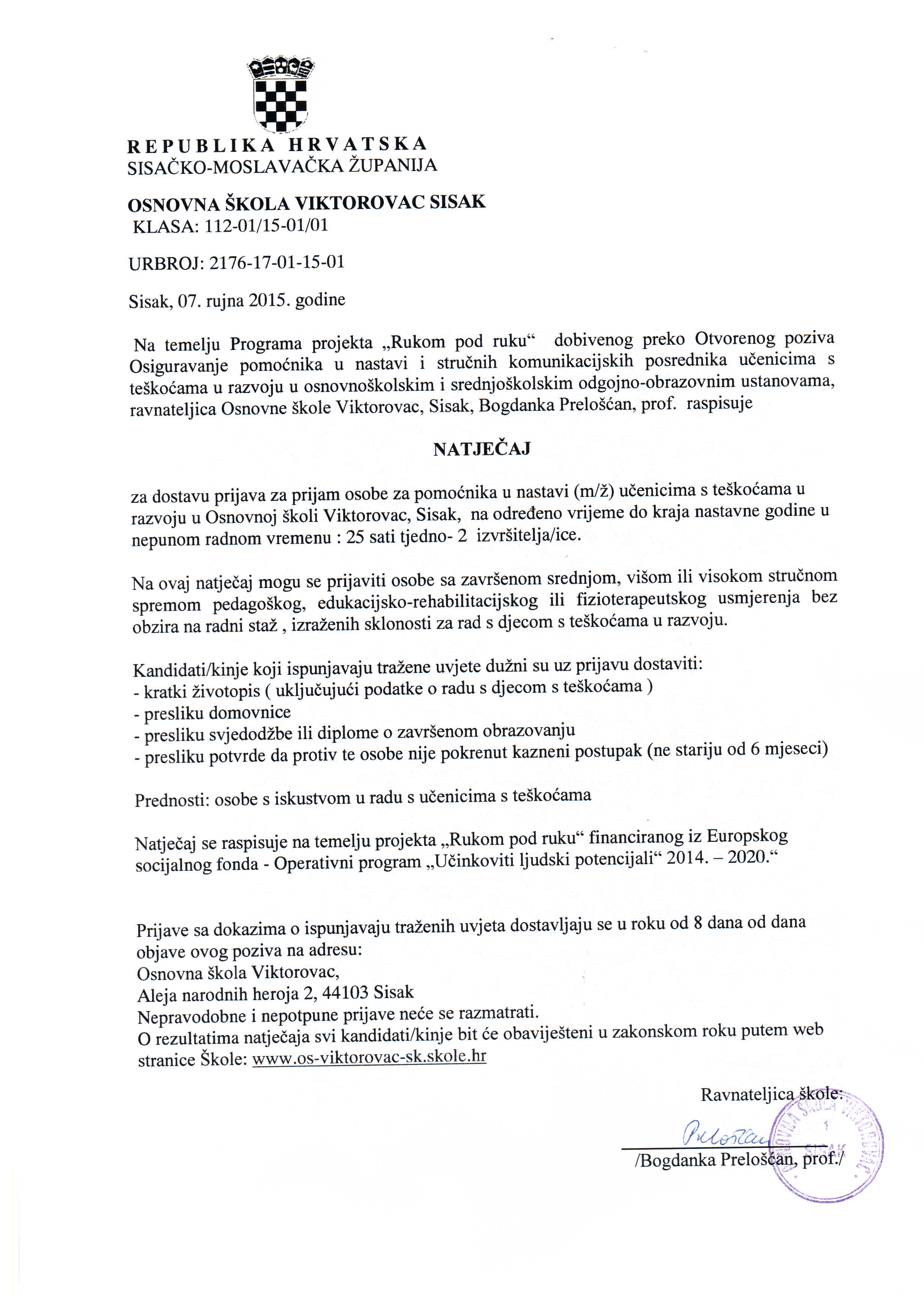 POMOĆNIK /ICA U NASTAVI škole na određeno puno radno vrijeme, 25 tjedno -2 izvršitelj/ica