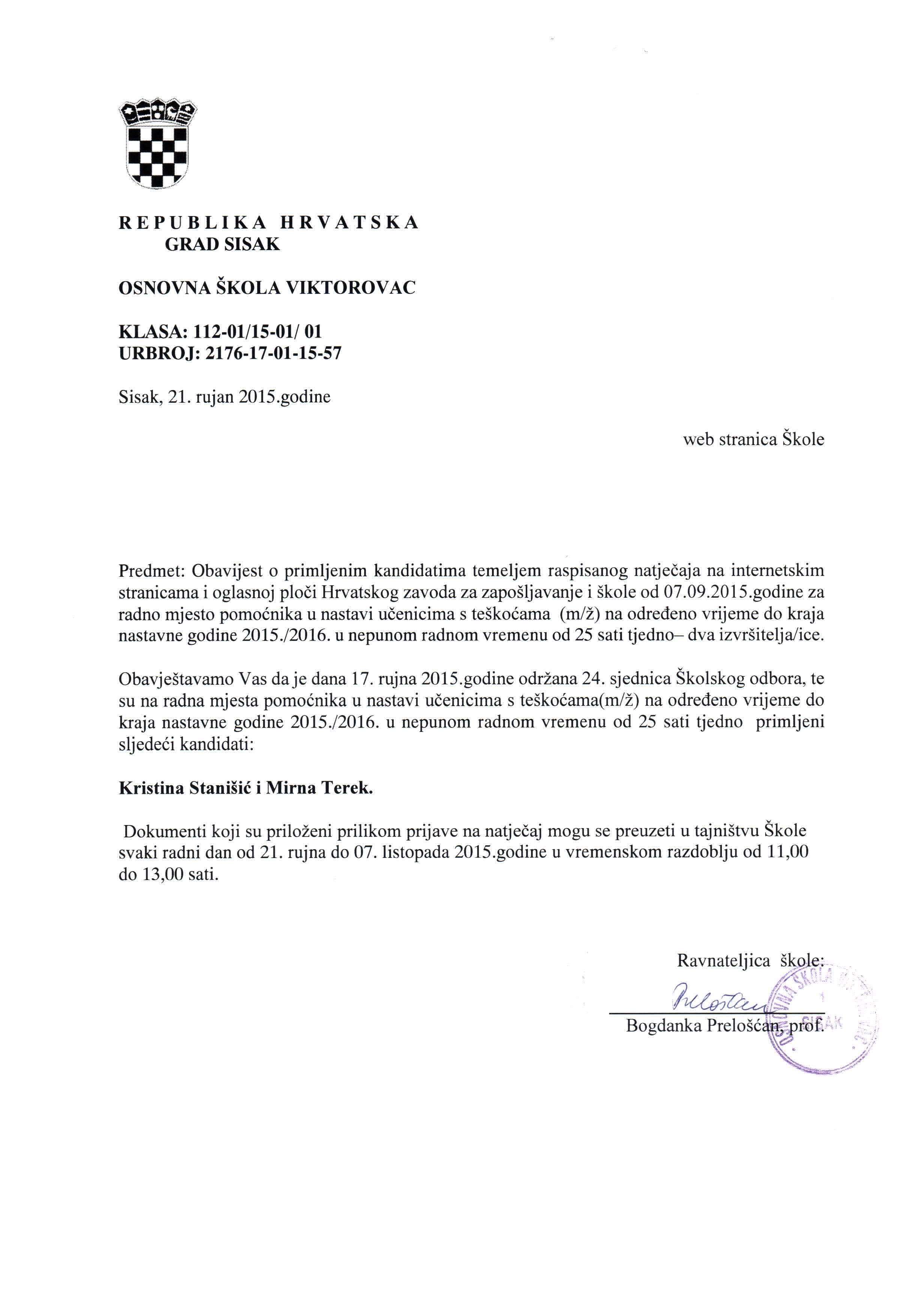 Rezultati natječaja pomoćnik/ica u nastavi: