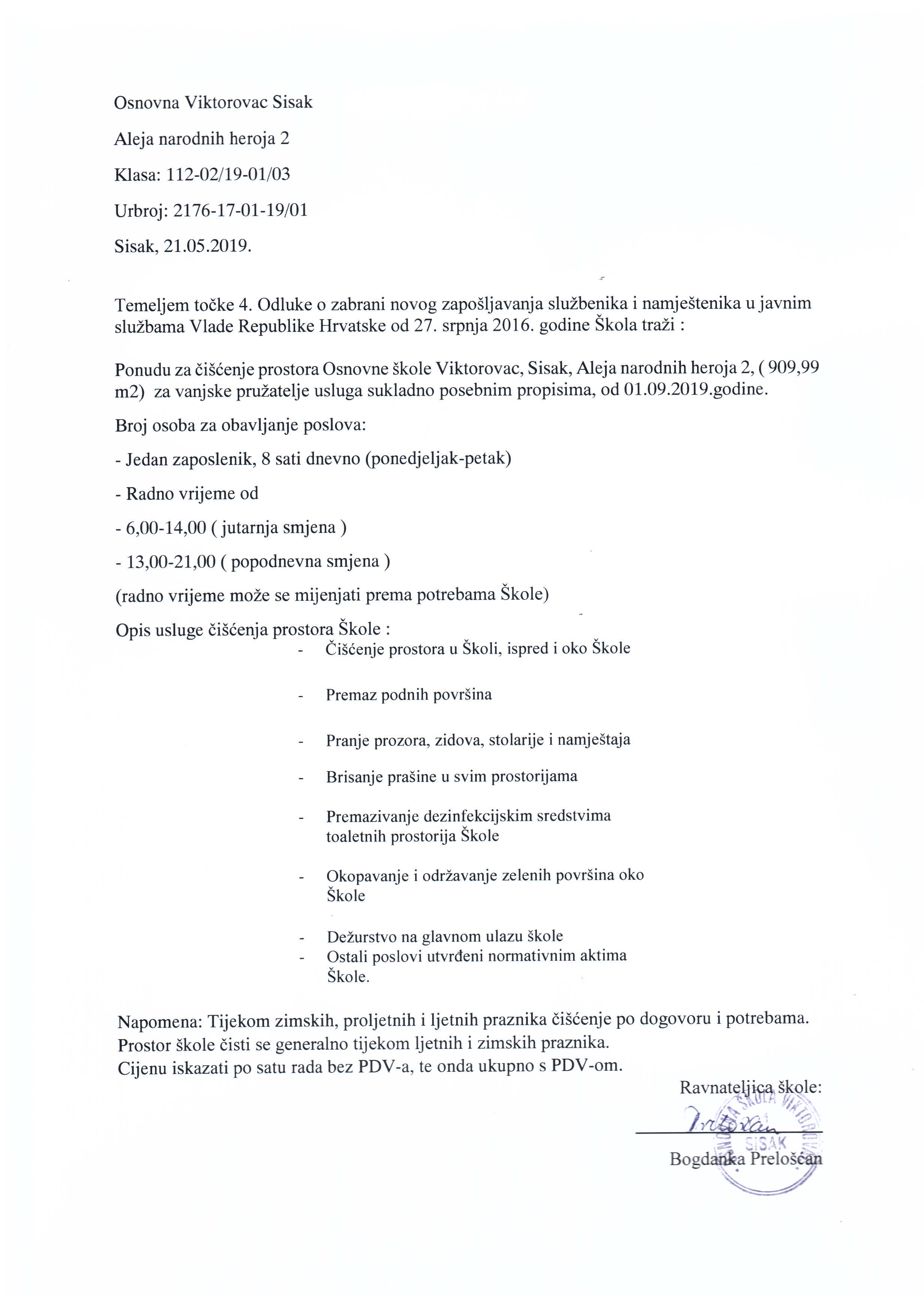 Temeljem točke 4. Odluke o zabrani novog zapošljavanja službenika i namještenika u javnim službama Vlade Republike Hrvatske od 27. srpnja 2016. godine Škola traži: