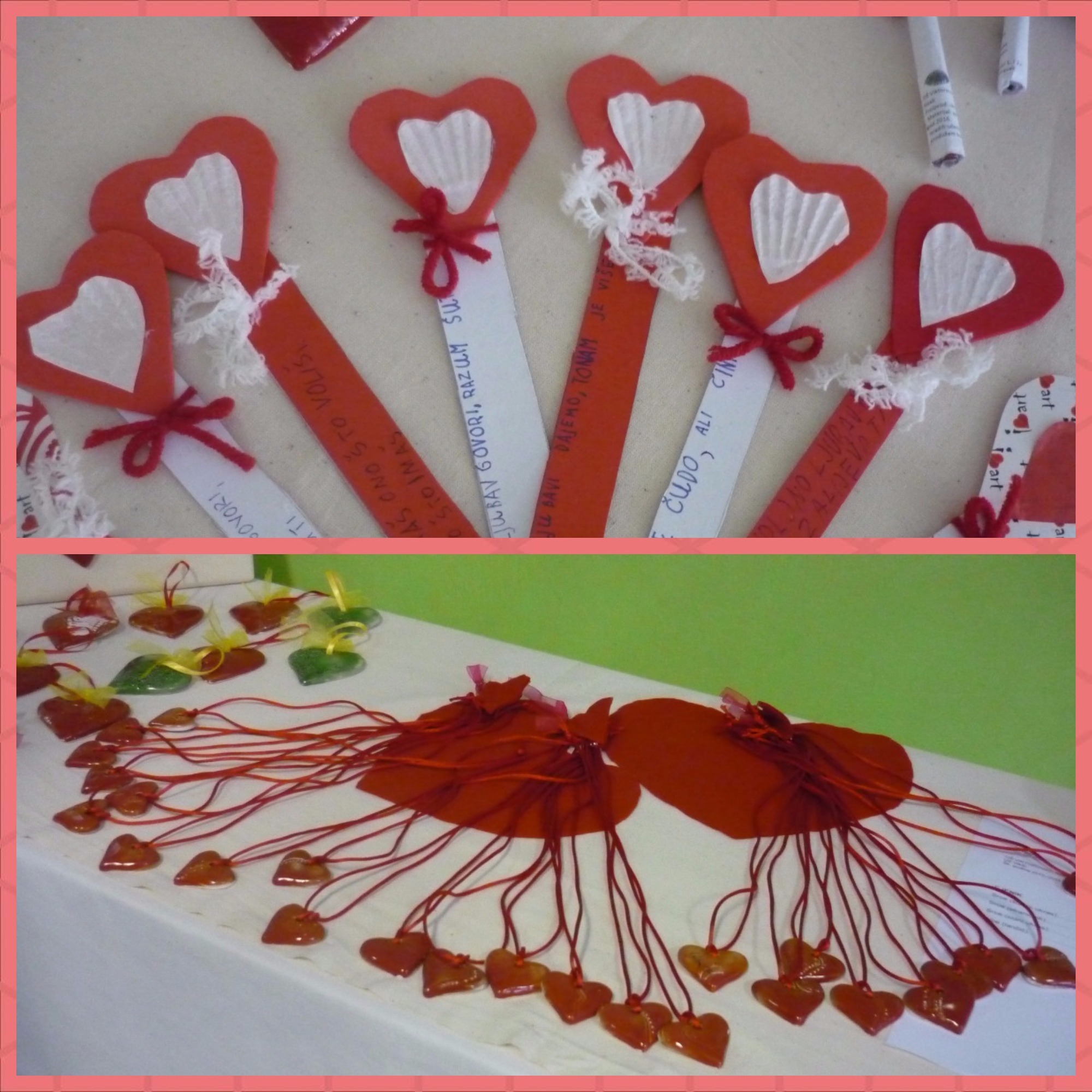 Zadrugari Kreativne stvaraonice i Mali ekolozi izložili su srca izrađena u keramici i papiru u boji: ogrlice, zidne ukrase, straničnike, štapne ukrase.